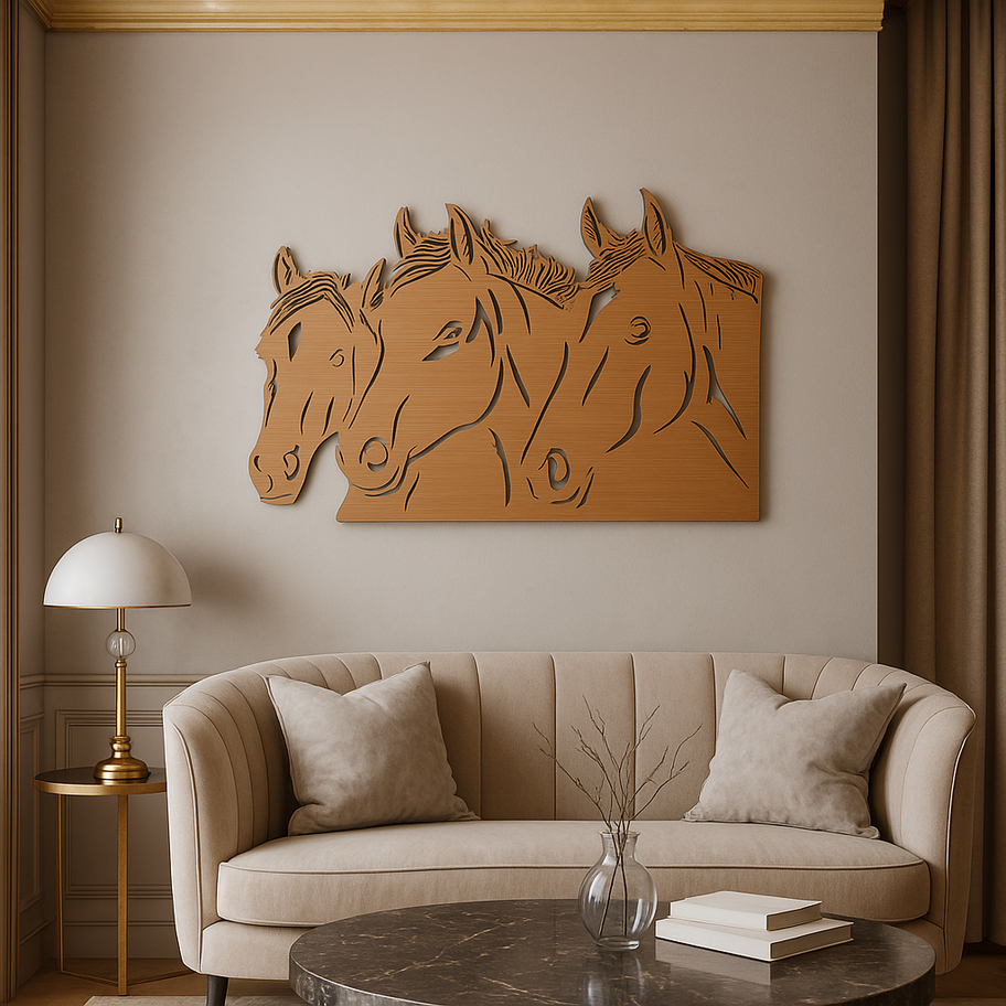 Dodajte svojmu interiéru nádych sily a slobody s touto jedinečnou dekoráciou. Dizajn zobrazuje tri majestátne konské hlavy vyrezané s absolútnou precíznosťou do kvalitnej a odolnej HDF dosky. Vďaka prírodnému vzhľadu a precíznemu líniovému spracovaniu vytvára na stene elegantný a pútavý akcent. Ideálna voľba pre milovníkov koní a nadčasového umenia.