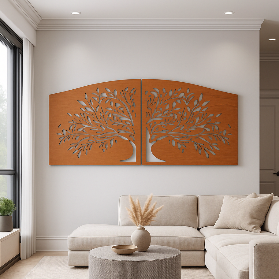 Oba diely sú precízne vyrezané laserovou technikou z kvalitnej HDF dosky v teplom prírodnom (bukovom) dekore. Rozdelenie motívu na dve symetrické časti ponúka jedinečný vizuálny efekt a umožňuje flexibilnejšie umiestnenie nad gauč, manželskú posteľ alebo do jedálne. Detailné spracovanie listov a konárov vytvára na stene premyslenú hru tieňov a dodáva priestoru hĺbku.