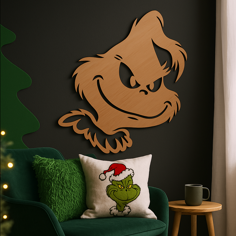 Oživte svoj priestor s touto zábavnou drevenou nástennou dekoráciou, ktorá zobrazuje detailnú štylizovanú hlavu ikonickej postavy Grincha. Grinch je zobrazený s jeho charakteristickým šibalským úsmevom a výrazom tváre, ktorý je okamžite rozpoznateľný. Celá dekorácia je precízne vyrezaná laserom z vysokokvalitnej HDF dosky s bledým a čistým dekórom Buku, čo jej dodáva prirodzený a sviatočný, no zároveň hravý vzhľad. Ideálny doplnok pre fanúšikov Grincha, na vytvorenie vianočnej atmosféry s nádychom humoru, alebo ako originálny darček, ktorý určite pobaví.