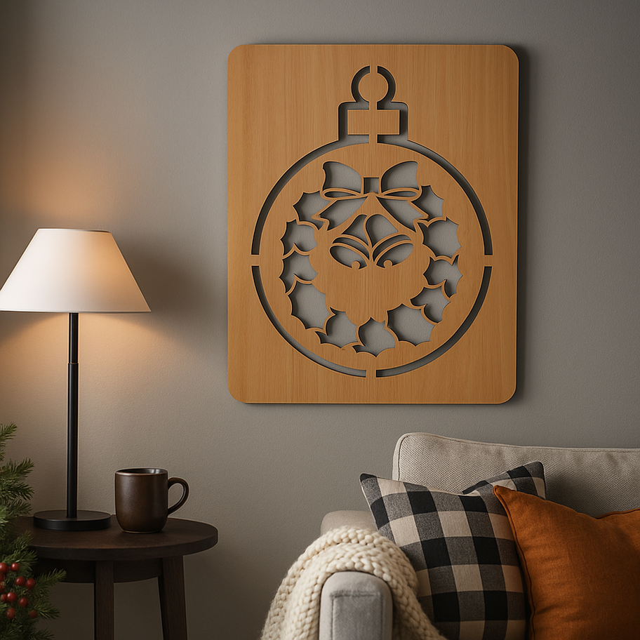 Vytvorte si tradičnú vianočnú atmosféru s touto elegantnou drevenou nástennou dekoráciou. Zobrazuje štylizovanú vianočnú guľu, vo vnútri ktorej je detailne vyrezaný vianočný veniec, dva prekrížené zvončeky a ozdobná mašľa. Celá dekorácia je precízne vyrezaná laserom z vysokokvalitnej HDF dosky, ktorá jej dodáva luxusný a prírodný vzhľad. Je ideálnym doplnkom pre obývacie izby, predsiene alebo akékoľvek priestory, ktoré chcete ozdobiť počas sviatočného obdobia a vniesť do nich tradičné vianočné motívy.