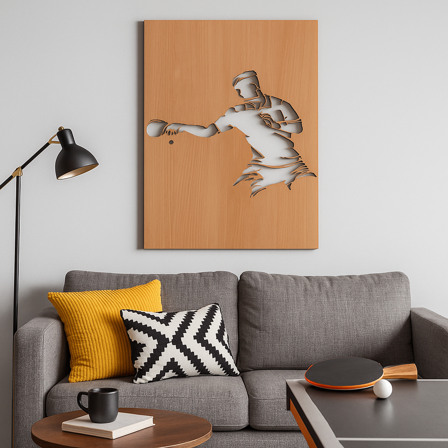 Premeňte svoju stenu na arénu stolného tenisu s touto elegantnou a dynamickou drevenou dekoráciou! Táto nástenná ozdoba, vyrobená z kvalitnej HDF dosky, zachytáva siluetu stolného tenistu v akcii, pripraveného k víťaznému úderu. Jej detailné spracovanie a kontrastné vrstvy pridávajú hĺbku a moderný šmrnc každému priestoru.
